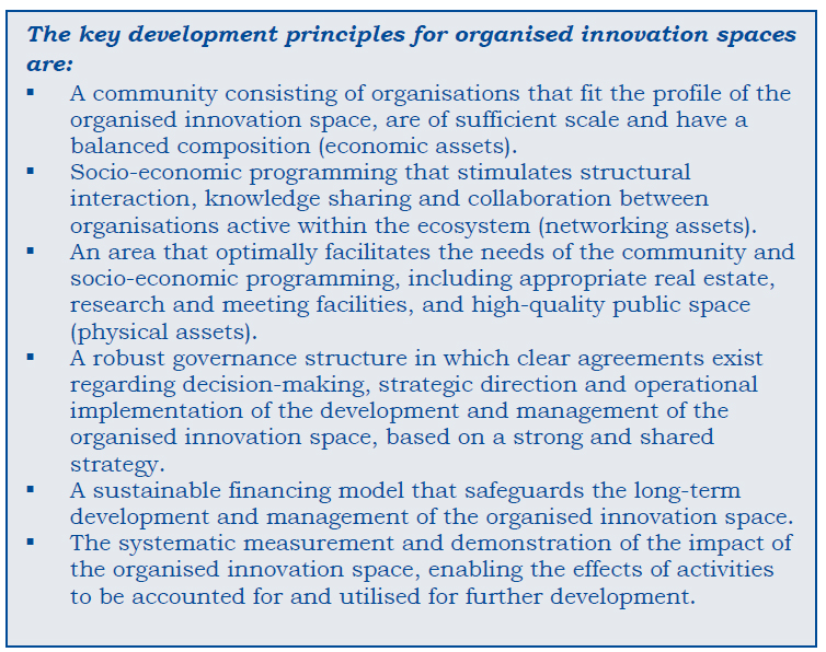 Other relevant perspectives are those of the users of organised innovation spaces, such as R&D companies and knowledge institutions (educational and research institutes), as well as those of facilitators: organisations that create the conditions for a well-functioning innovation space. Examples include providers of incubator and accelerator programmes, as well as real estate investors and developers. The following two examples illustrate the diversity of these perspectives.