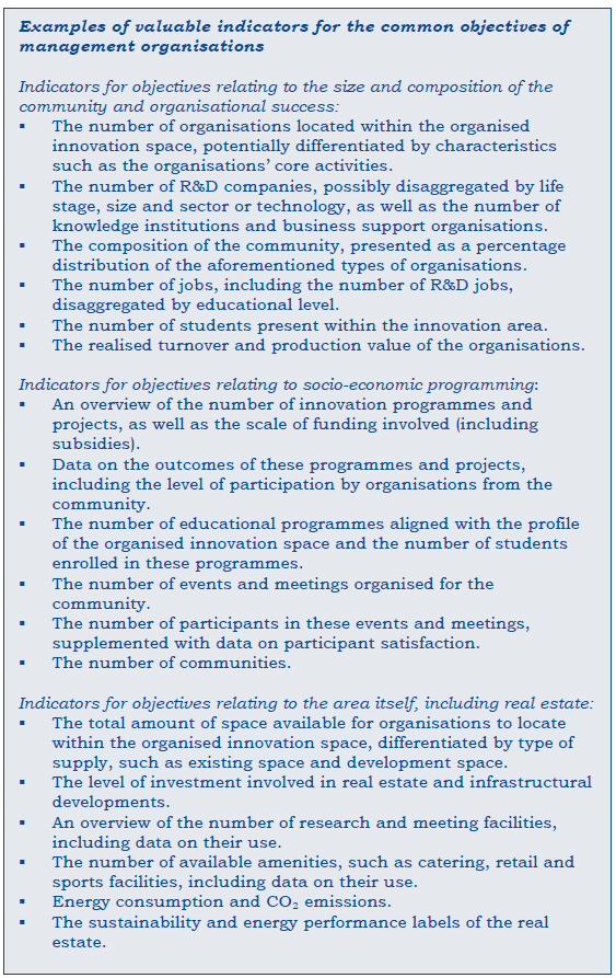The primary perspective is that of the organisation responsible for developing and managing an innovation area (hereinafter, the management organisation). This often concerns ecosystem development, also referred to as socio-economic programming. Well-known examples include Stichting Utrecht Science Park, High Tech Campus Eindhoven Site Management B.V. and Kilometro Rosso Innovation District. Some of these organisations are also responsible for developing the physical area. From the perspective of a management organisation, impact is measured by the extent to which it has achieved the intended objectives for socio-economic programming and/or the physical area, and by the degree to which this has made the innovation area more successful.