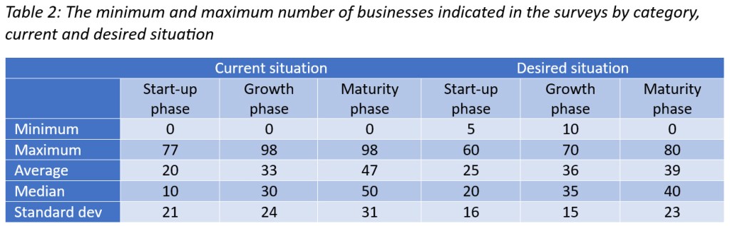 Almost half of the companies in the surveyed science parks are at the maturity stage (Table 1). Growers have a 33% share, and start-ups are the smallest group at 20%. Overall, this is not seen as the ideal situation by everyone. Ideally, there should be more start-ups and scale-ups in the science park at the expense of the established, mature companies. This provides a clear initial picture, but behind those averages are the figures for the different science parks (Table 2). There are not very large differences between the median and the mean. This means that the data are evenly distributed on both sides of the mean. However, we also note that the dispersion around the mean is large.