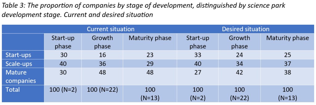 As a park ages, the proportion of companies in the growth and maturity stages increases (Table 3). However, in the current situation, that ratio is not always the ratio envisioned by management. Science parks in the growth phase would have a larger share of start-up companies at the expense of mature companies. For mature science parks, growth companies would be allowed to have a larger share than mature companies.