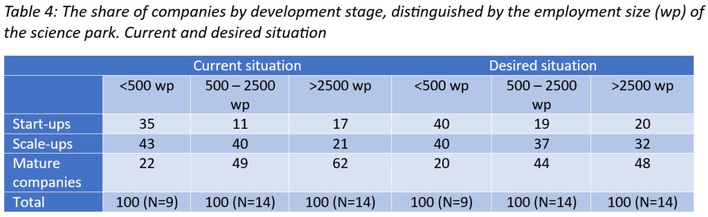 The figures obtained further indicate that the size of a science park, in terms of the number of jobs, affects the business composition (Table 4). The larger a science park is, the proportion of start-up companies decreases, and mature companies increase. Up to 2,500 people employed, scale-ups still have a share of around 40 per cent, but this is halved when the size exceeds 2,500 people employed. This is seen as less desirable by the managers of these large parks because, in the ideal situation, according to the managers, this share should have been one-third at the expense of the share of mature companies.